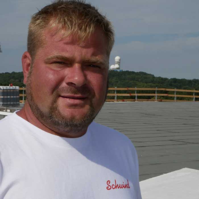 Für den erfahrenen Dachdecker ist es das erste Mal, dass er die Dichtigkeit eines Flachdachs sensorgestützt überprüft. Durchaus bekannt ist dem langjährigen Vorarbeiter hingegen die konservative Kontrollmethode: die Flutung. Wie bei vielen Dachexperten überwiegt hier aber auch bei ihm die Skepsis. Neben den Risiken und der fehlenden Genauigkeit kritisiert Dachdecker Frank Lenser vor allem die Anwendbarkeit: „Wir reden hier ja von deutlich mehr als 10 000 m2 Dachfläche – es sind nur zwei Kehlen vorhanden, bei denen ein Entwässerungssystem abläuft. Diese Halle hat eine Spannweite von 100 m – da halte ich eine Flutung für zu gefährlich. Wir haben einen Höhenunterschied von der Traufe bis zum First von rund einem Meter, da kann man sich vorstellen, was da an Wasser und Gewicht draufpassen würde.“